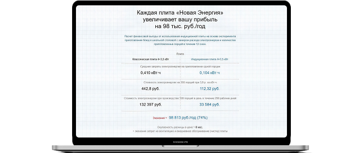 3. Упаковали в слоган: «Индукционные плиты с экономией до 80%», чтобы заинтересовать людей цифрой, а потом уже объяснять, из чего она складывается.
