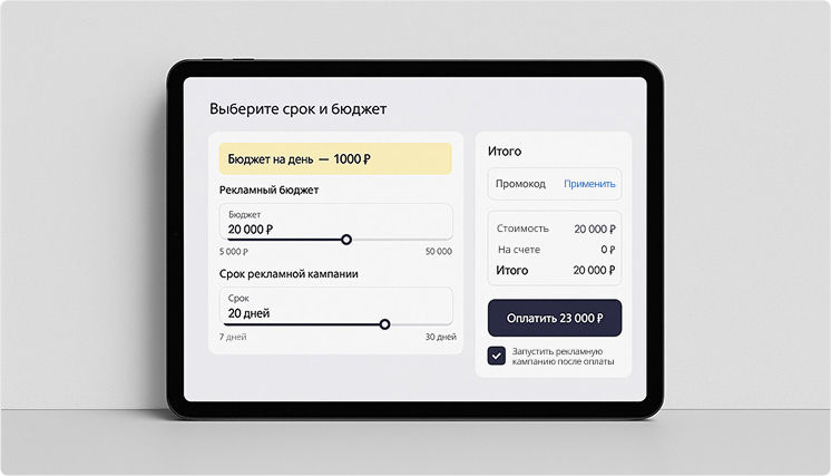 Минимальный бюджет — 5000 рублей на весь период. Минимум 1000 рублей в день. Кампанию можно запустить на срок от 7 до 30 дней.