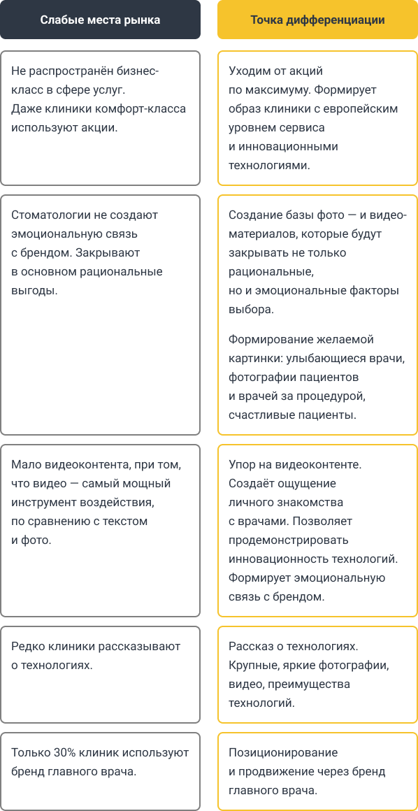 Перед нами стояла задача — сделать флагманским продуктом клиники сложные, высокомаржинальные услуги (имплантация и протезирование). Поэтому и в исследовании, и в стратегии мы сделали упор именно на них.