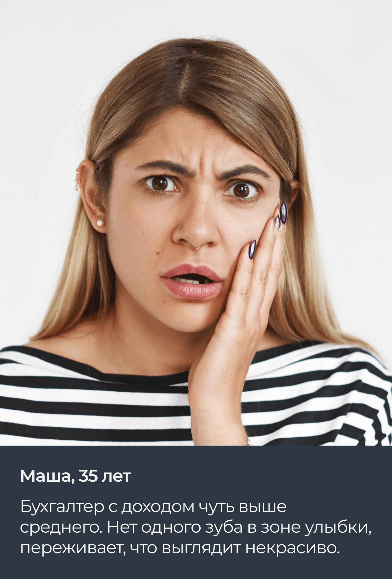 Имеет ли значение, сколько лет потребителям, какого они пола и характера? Красивая улыбка может быть нужна, как женщине среднего возраста, так и пожилому мужчине. Гораздо важнее, какую «работу» они хотят получить от продукта. Сегменту, которому важно красиво выглядеть, мы покажем результаты работ «до» и «после». Другим — отзывы о том, как легко и приятно стало есть любимую пищу после операции.