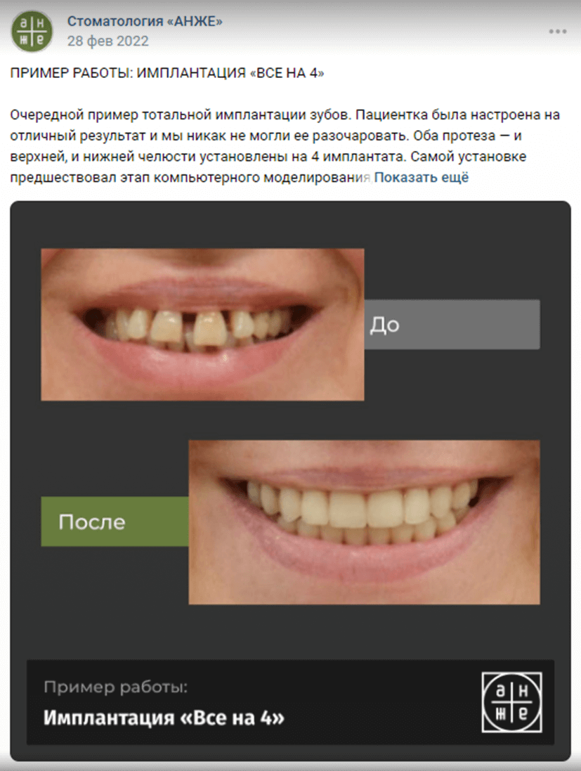 Примеры работ «до» и «после» мы добавили для потребителей, которым важна «работа» услуги — эстетичный вид. На сайте они могут увидеть желаемый результат, что простимулирует обратиться в клинику.