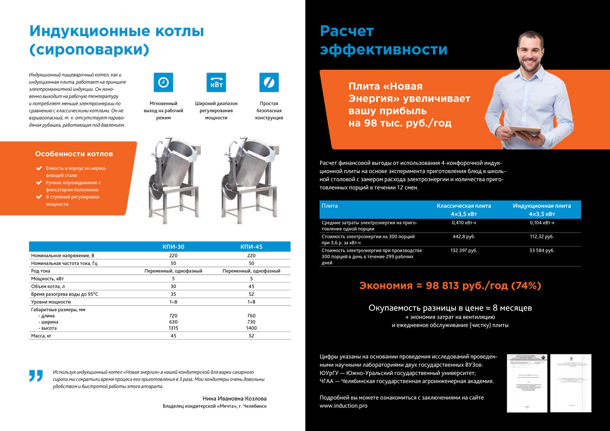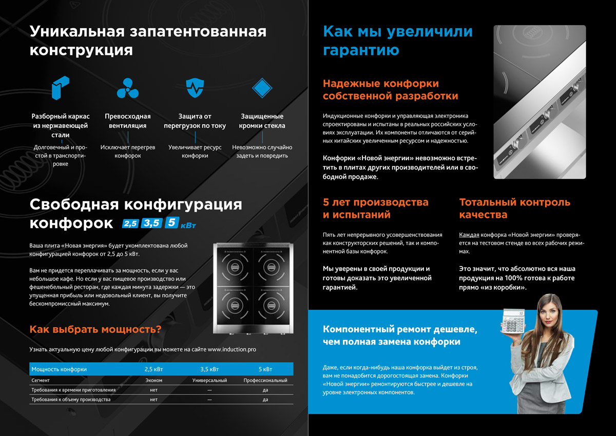 Для эффективной работы отделу продаж нужны презентационные материалы. Их сотрудники отправляют на почту потенциальному клиенту после консультации по телефону или оставляют при личной встрече. Мы сделали буклет и видеоролик, в которых рассказывали обо всех преимуществах индукционных плит.