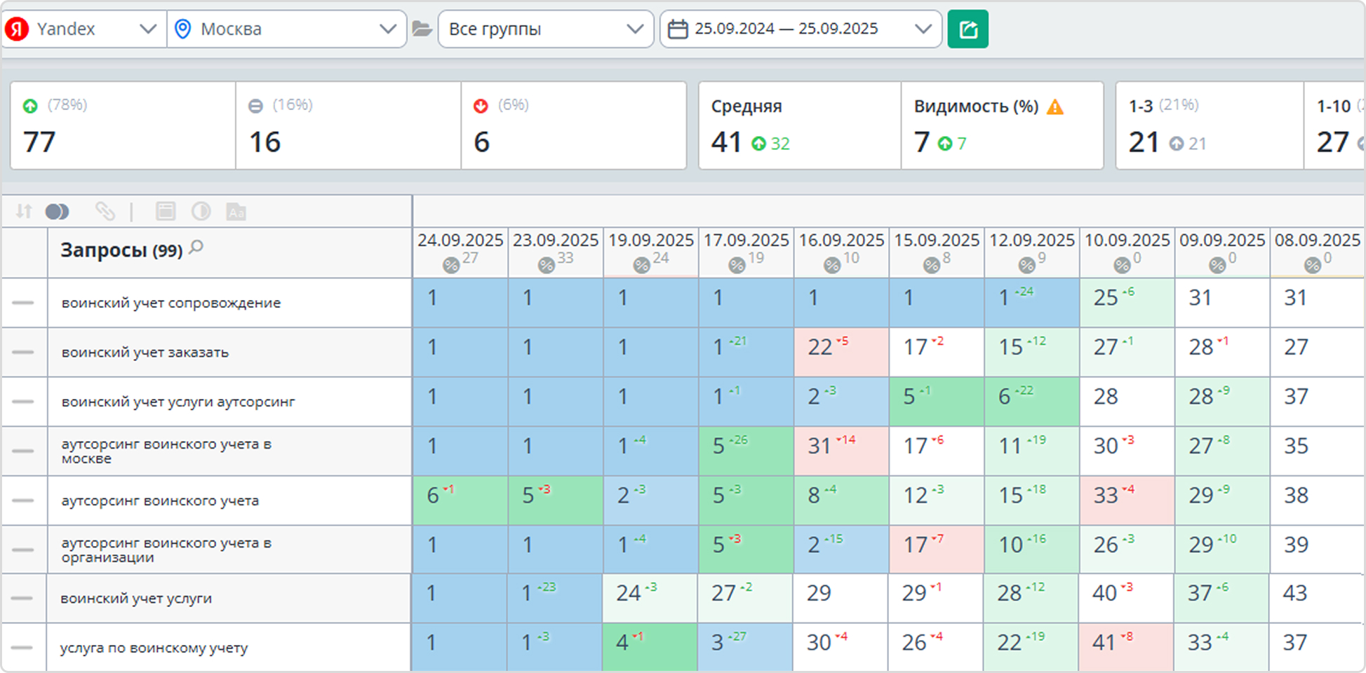 При этом посадочные страницы по направлениям были «размножены» под конкретные запросы: например, охрана труда получила сразу 5 страниц, а кадровое делопроизводство — 4. Каждая была уникализирована. Такой подход дал ожидаемый результат: уже через несколько месяцев страницы с нуля вышли в ТОП3 и ТОП10 по целевым запросам — впервые появился органический поток лидов.