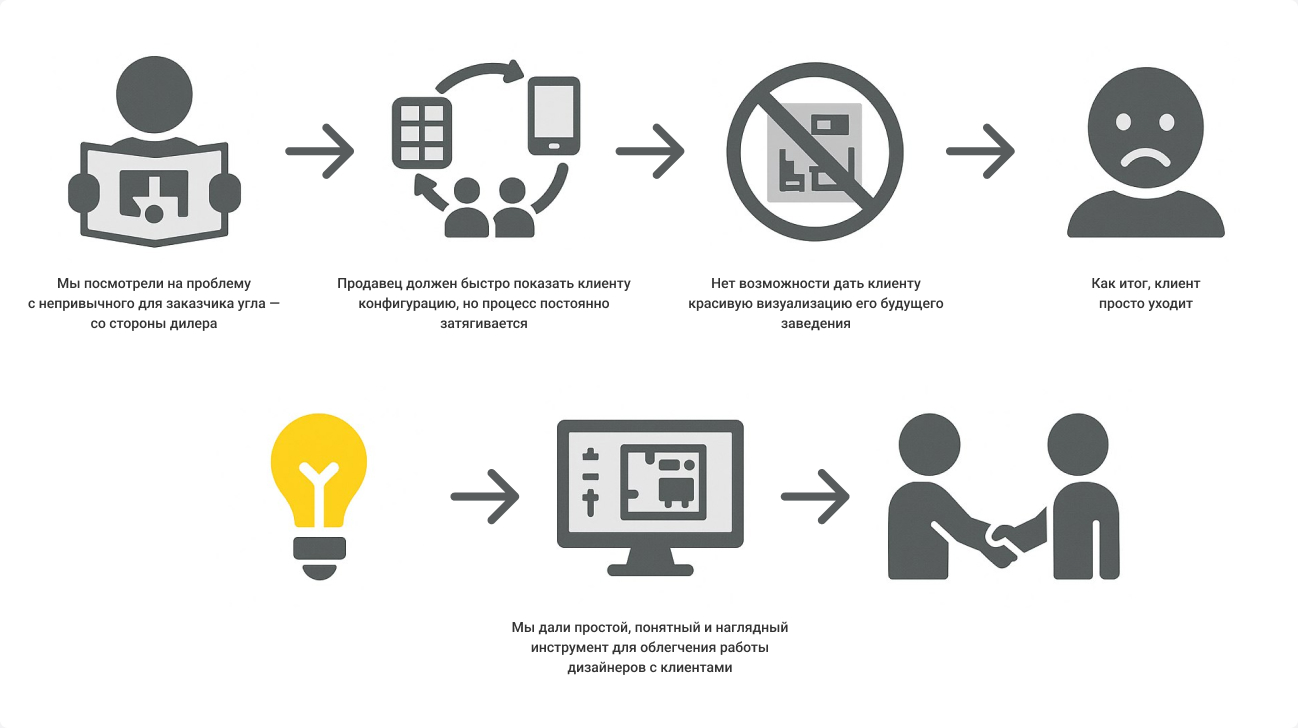 Мы снова начали с изучения — только здесь нашей аудиторией были дилеры — и провели серию глубинных интервью, чтобы выявить основную «боль». И когда мы перестали смотреть на проблему как производитель, а посмотрели на нее как дилер, всё встало на свои места.