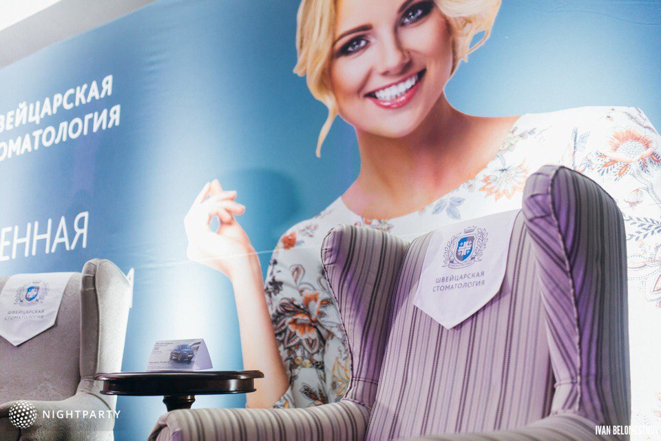Часть помещения, где проходило мероприятие, оформили в стиле «Швейцарской стоматологии». Гостям предлагали совершить виртуальный захватывающий полет над Швейцарией.
