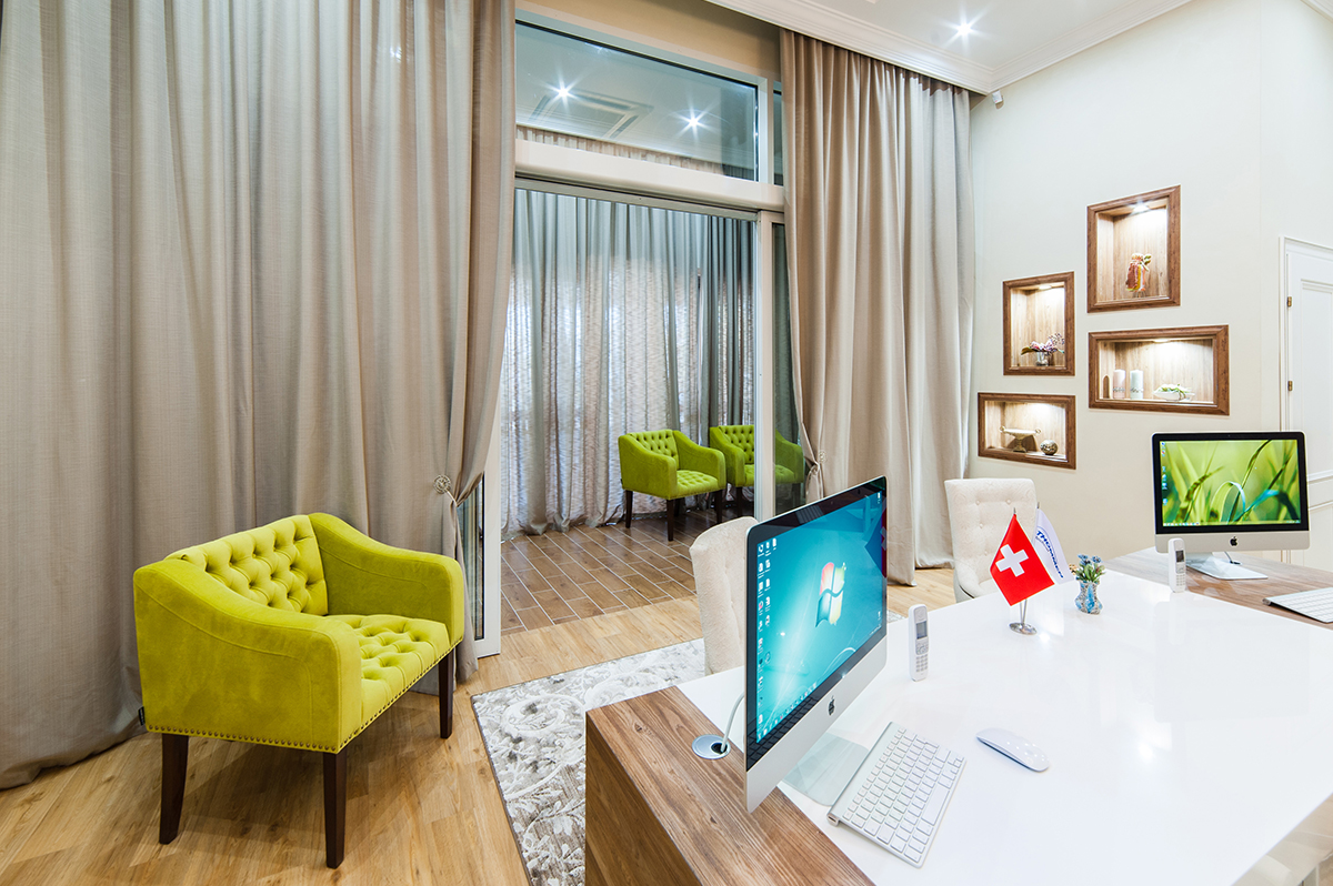 Мы разработали новый стиль ресепшена — отказались от стандартных высоких стоек, когда гости вынуждены стоять, а администратор «заныривает» за стойку и теряет контакт с пациентом. На нашем ресепшене гости комфортно устраиваются в кресле, пока администратор оформляет документы.