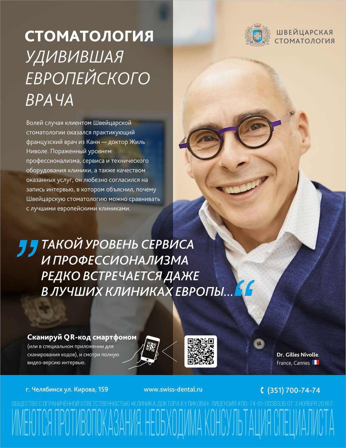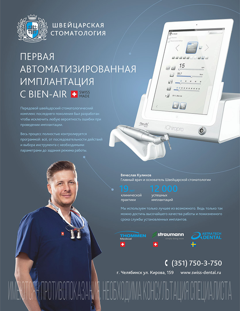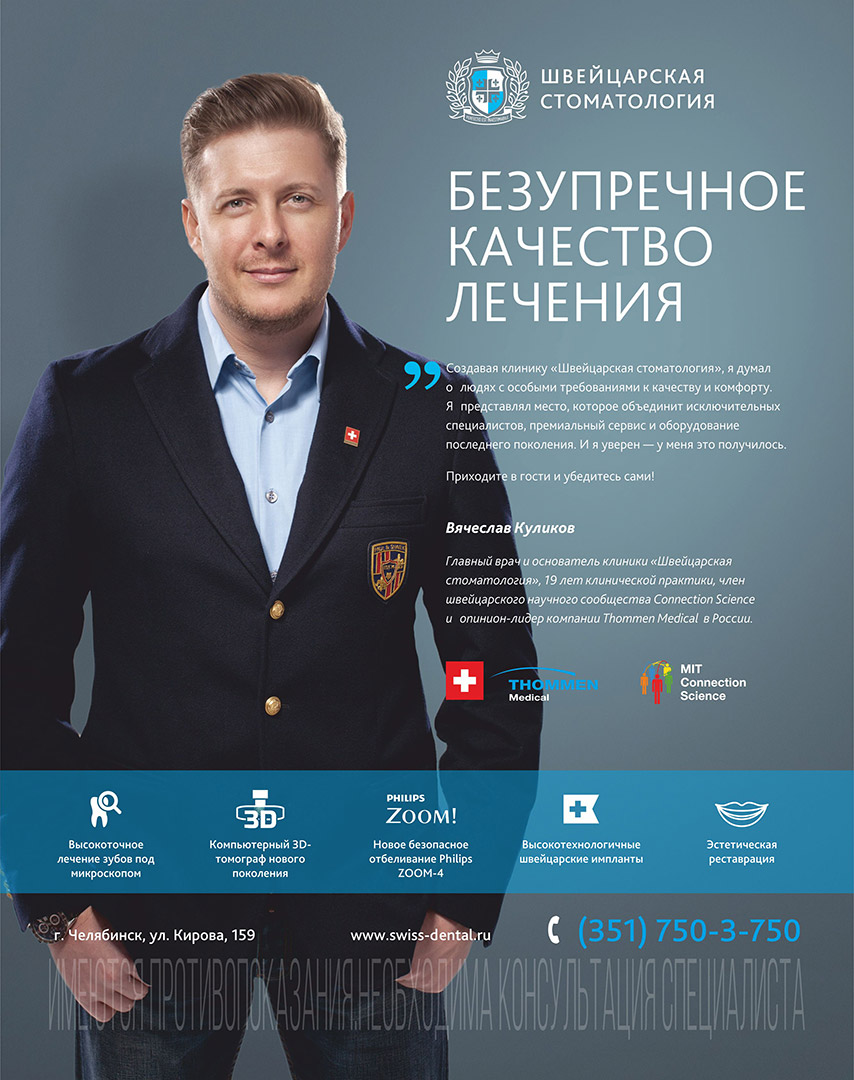 «Стандарты лучших европейских стоматологий, швейцарская точность и безупречное качество теперь доступны в самом сердце Челябинска — деловом центре «Челябинск-Сити». Больше не нужно ехать за границу, чтобы получить эксклюзивное качество лечения и особое отношение.