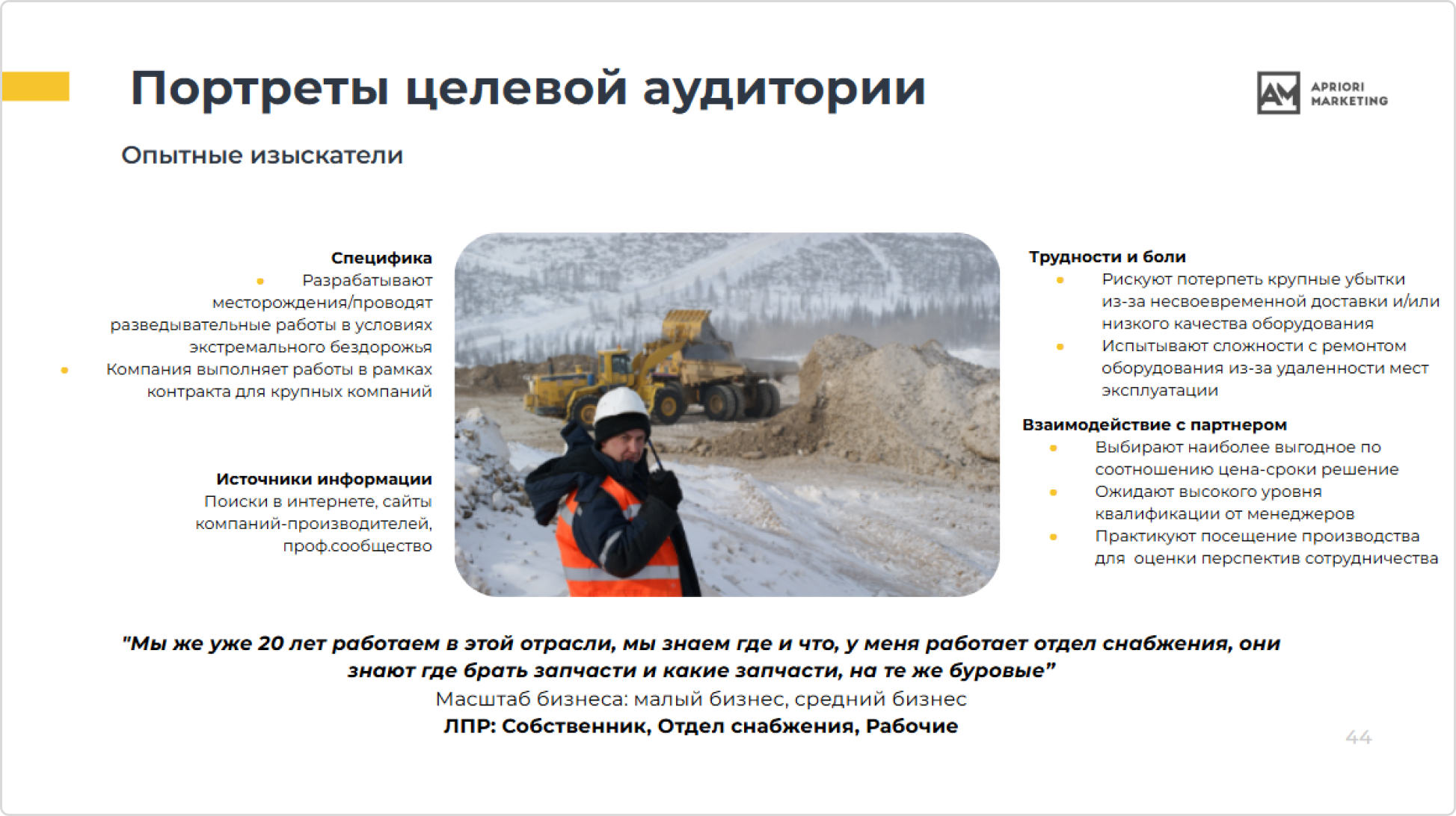 Мы использовали JTBD-подход (“работа, которую должен выполнить продукт“). Для гусеничных вездеходов эта «работа» звучит просто: помогать компаниям профессионально и без задержек выполнять буровые или разведывательные работы в условиях, где дорог нет и другая техника не в состоянии проехать. Но за этой простой формулировкой скрывается целая система контекстов, страхов и привычек.