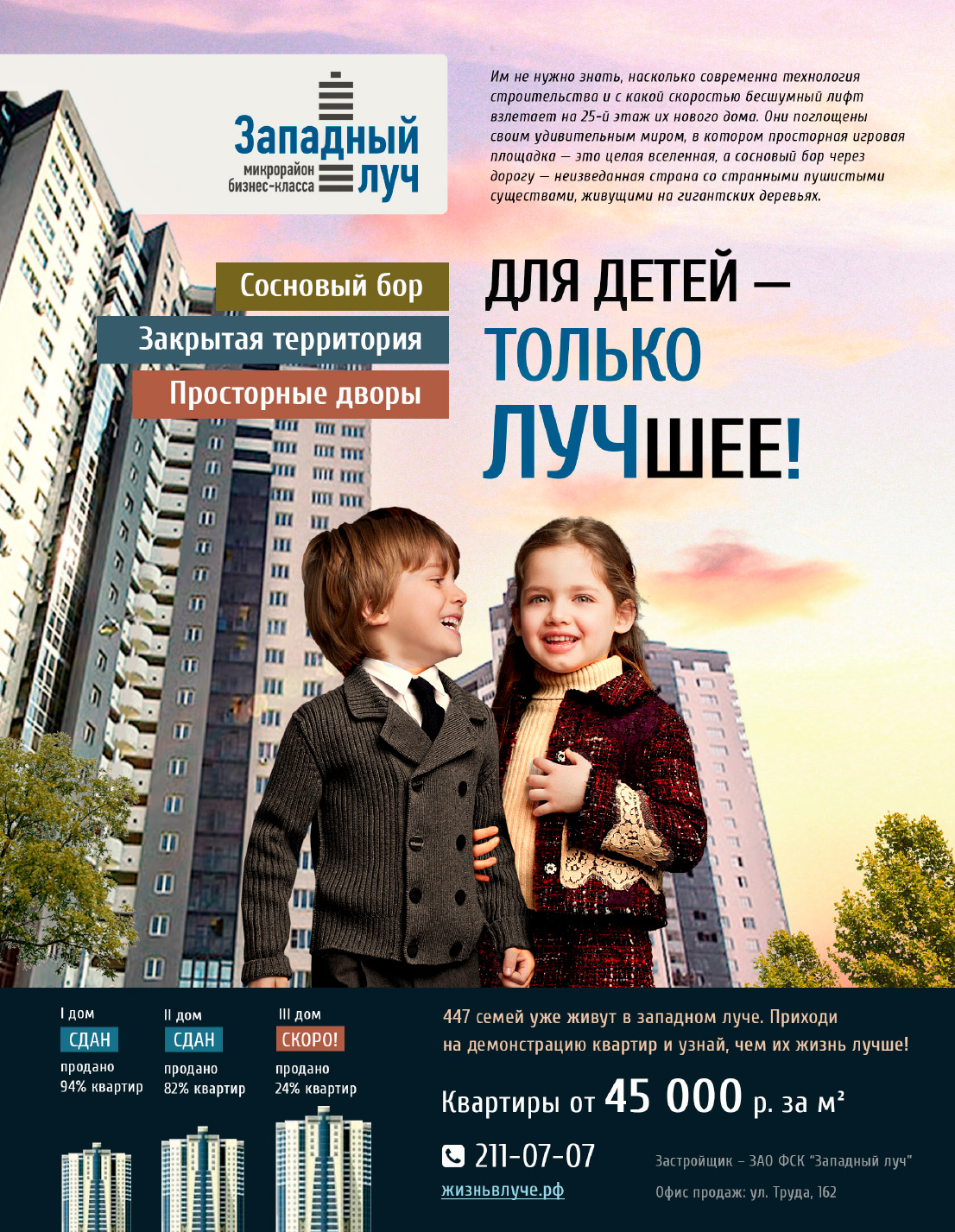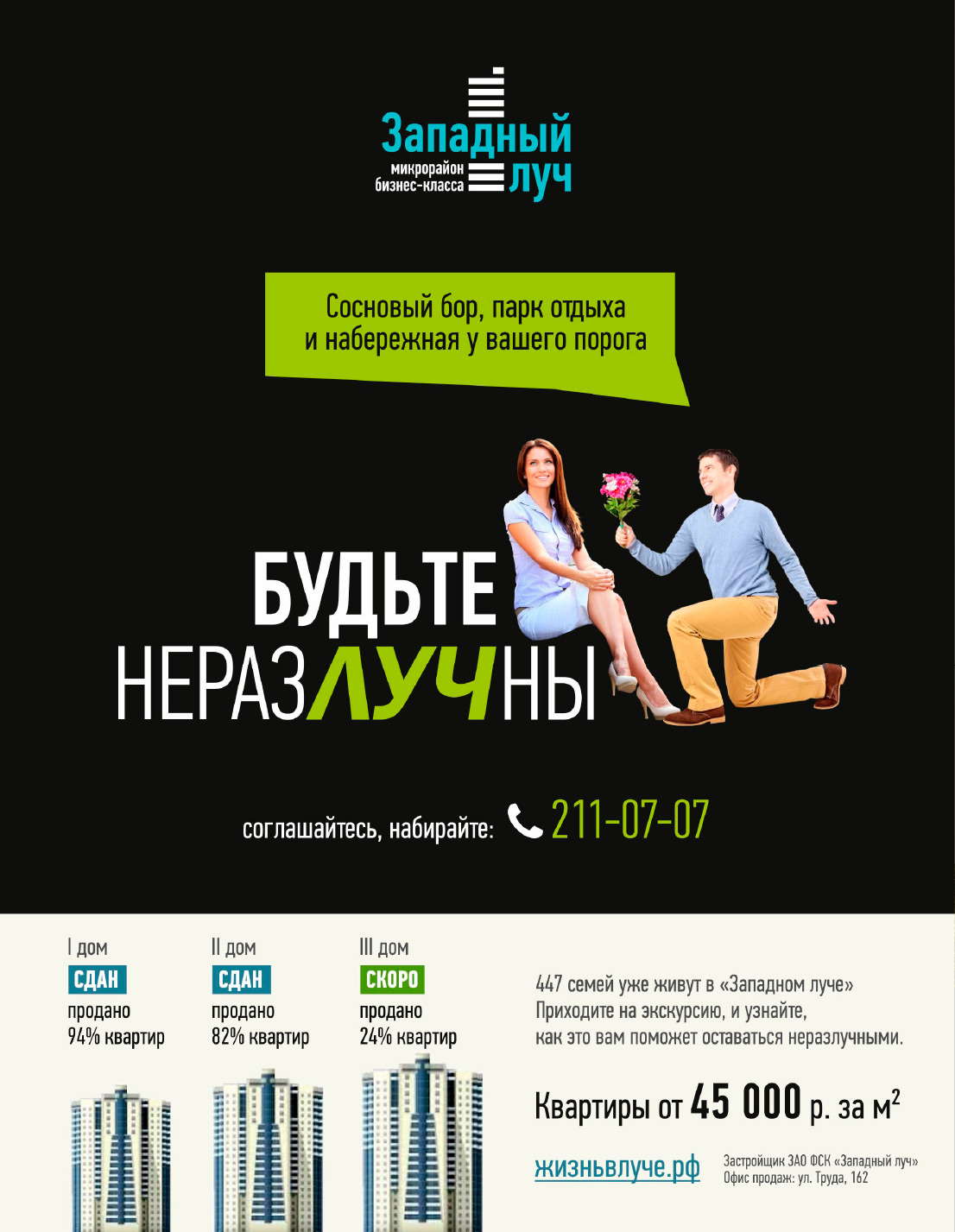 «Западный луч» – это слишком дорого. Такое мнение сложилось в определенных кругах на основе предыдущих рекламных кампаний. Решение проблемы — указание в рекламе минимальной стоимости квартиры или квадратного метра площади.