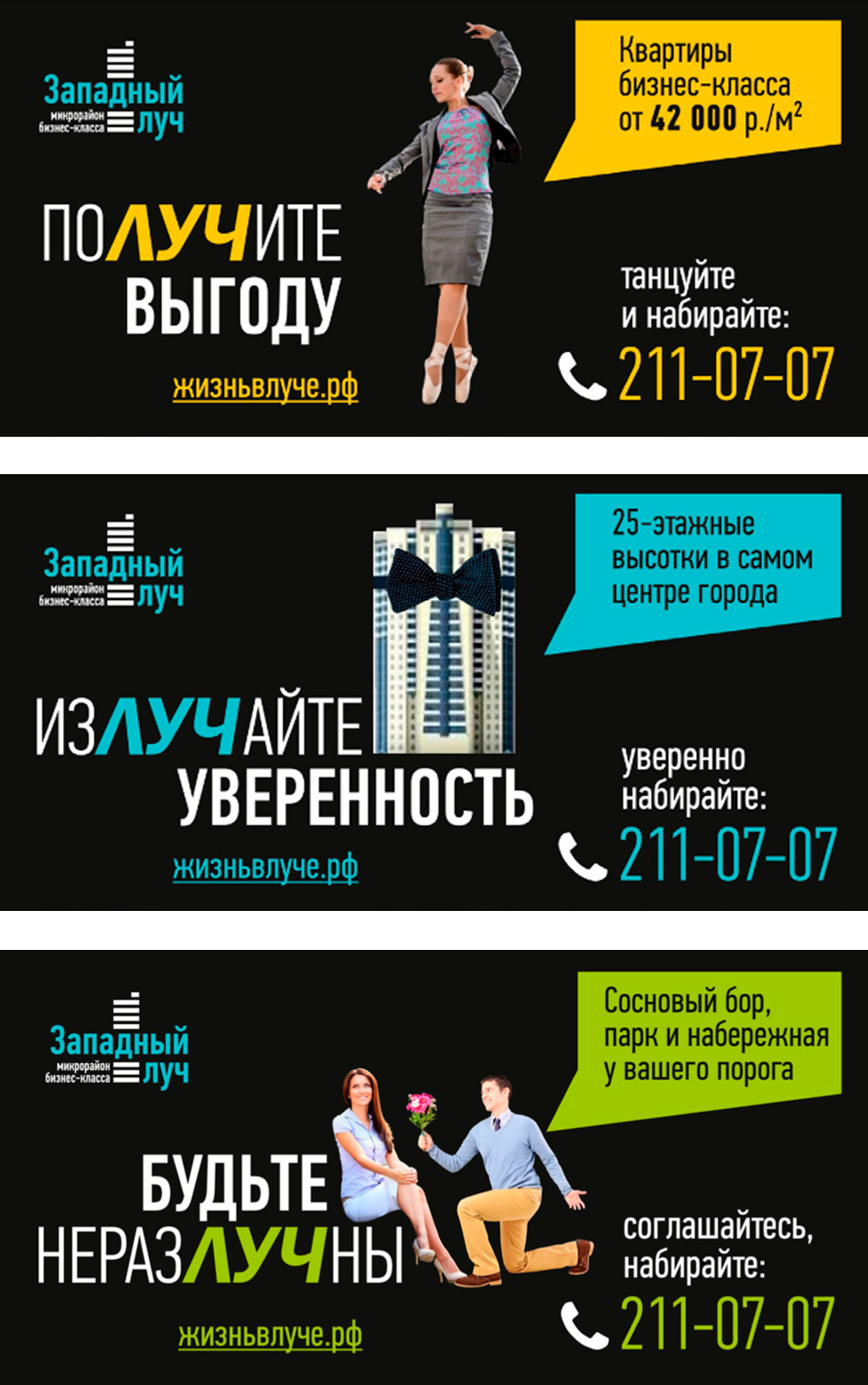 Рекламная кампания строилась на донесении преимуществ ЖК «Западный луч» через понятные и близкие потребителю образы, заложенные в платформе бренда. Чтобы реклама плотно ассоциировалась именно с нашим брендом, его название обыграли присутствием слова «ЛУЧ» во всех слоганах.
